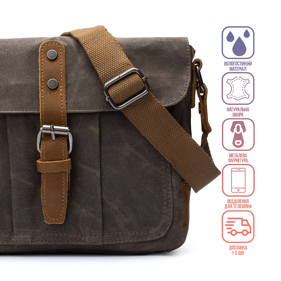 Сумка виготовлена зі щільного, стійкого до вологи, вощеного канвасу та має розміри 27х20х8 см.