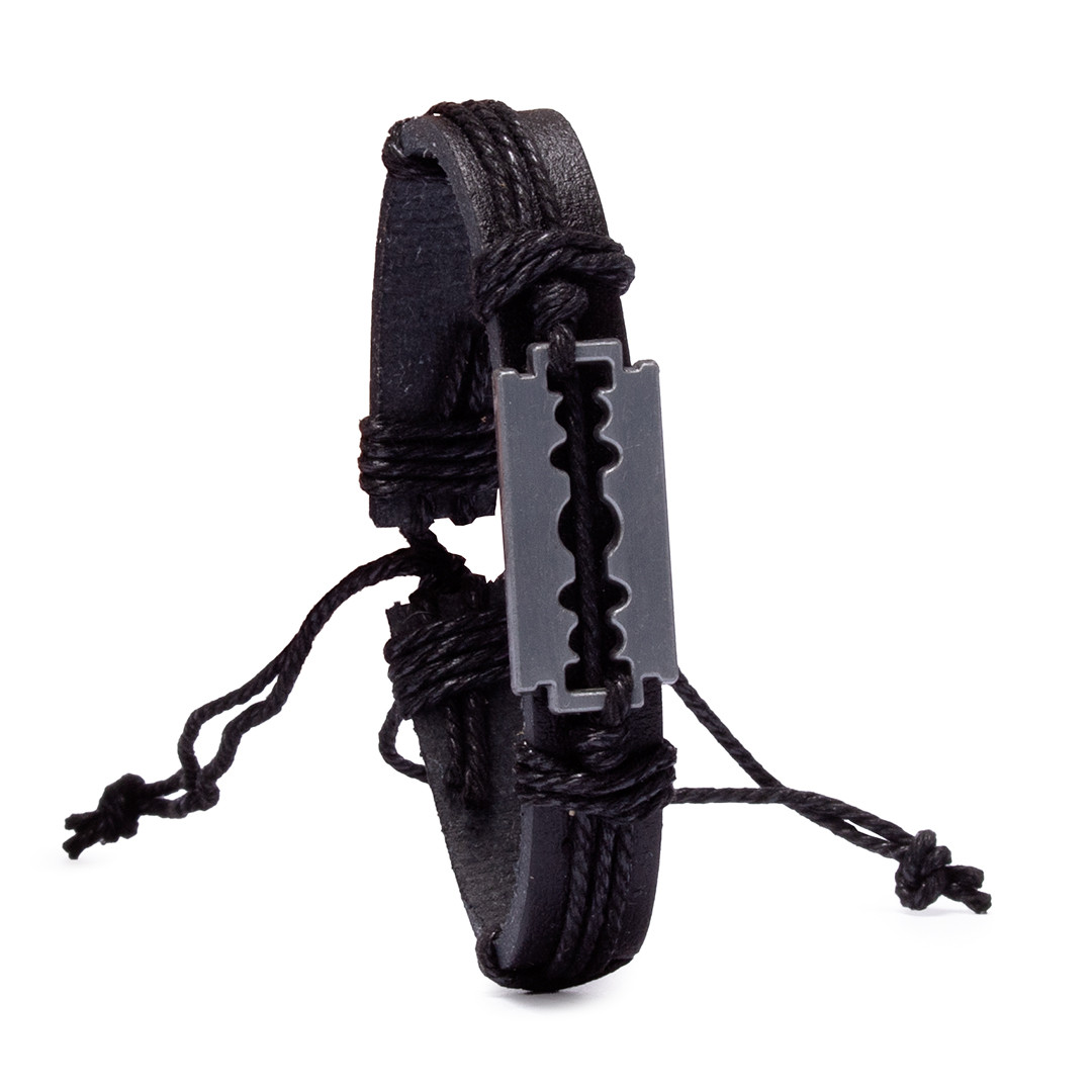 Браслет на руку шкіряний чорного кольору з фурнітурою у вигляді декоративного металевого леза. Браслет затягується за допомогою ковзного вузла.